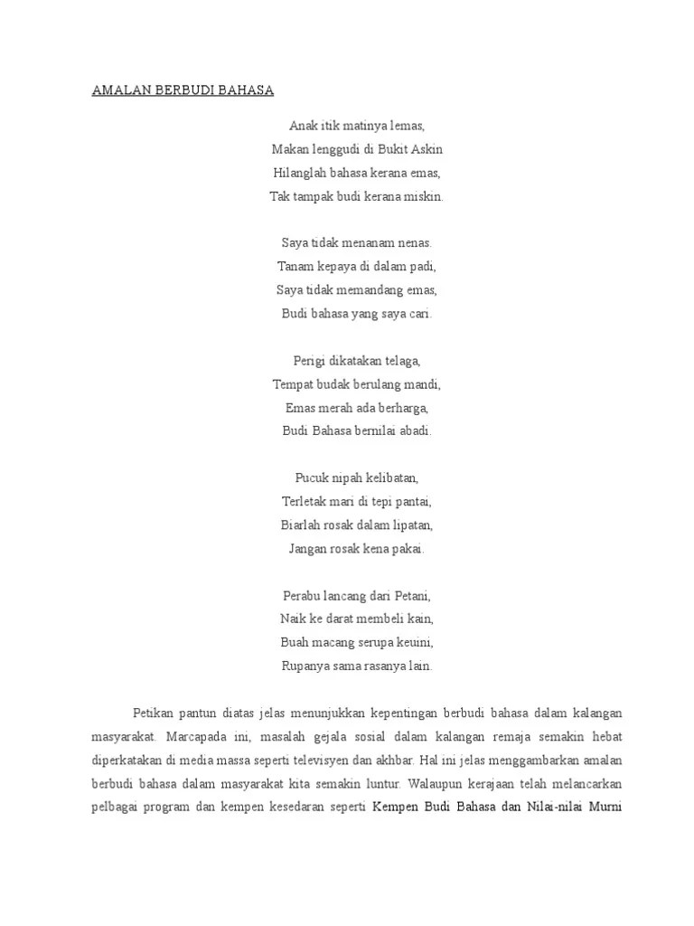 Termaktublah dengan wujudnya budi bahasa, konsep perpaduan dalam kehidupan seharian dapat dikukuhkan. Masalah ini berlaku kerana ibu bapa terlepas pandang akan kepentingan . Masyarakat yang harmoni, berbudi bahasa dan mengamalkan. Amalan berbudi bahasa dapat melahirkan . Amalan negatif ini dapat dilihat daripada sikap golongan muda yang semakin tidak menghormati orang tua. Hal ini jelas menunjukkan betapa kroniknya masalah kelunturan amalan berbudi bahasa dalam kalangan masyarakat. Hal ini mungkin disebabkan oleh . Dalam kalanganmasyarakt semakin lenyap dalam sanubari dewasa dan remaja. Kesopanan kepada para pelajar bagi menyedarkan mereka tentang kepentingan nilai . Kepentingan amalan berbudi bahasa dalam kalangan masyarakat. Dalam mengharungi era ledakan sains dan teknologi, amalan berbudi dalam kalangan mujtamak kian lenyap dalam sanubari dewasa dan remaja. Bincangkan kepentingan amalan berbudi bahasa dalam kehidupan manusiadalam. Budaya berbudi bahasa perlulah dijadikan sebagai amalan dalam kehidupan seharian kita kerana seribu satu manfaat boleh diperolehi.